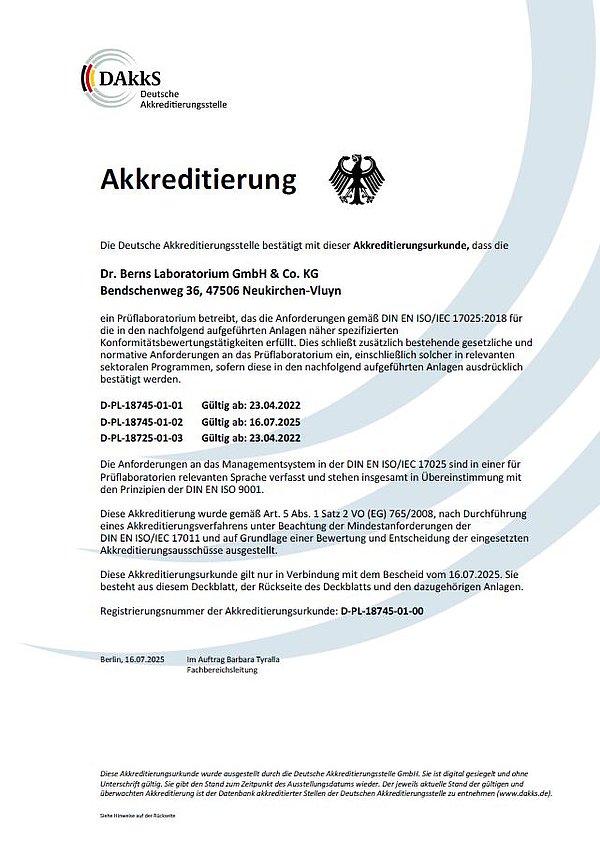 Höchste Ansprüche. Grundlage unserer Analytik nach DIN EN ISO 17025:2018 bilden nationale und internationale Normvorgaben. Sorgfältige Validierung, laufende Qualitätssicherungsmaßnahmen sowie regelmäßige Teilnahme an Eignungsprüfungen (Ergebnisse auf Anfrage erhältlich) sichern Richtigkeit und Reproduzierbarkeit unserer Ergebnisse. Gutachter der deutschen Akkreditierungsstelle DAkkS überwachen regelmäßig die Einhaltung der Anforderungen der DIN EN ISO 17025:2018.